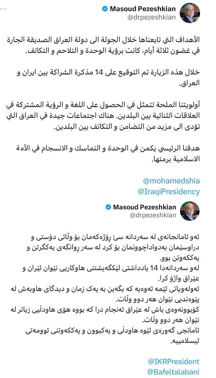 به گزارش تدبیرشرق، مسعود پزشکیان، رئیس جمهوری کشورمان در یادداشتی به زبان کردی و عربی در شبکه اجتماعی ایکس نوشت: